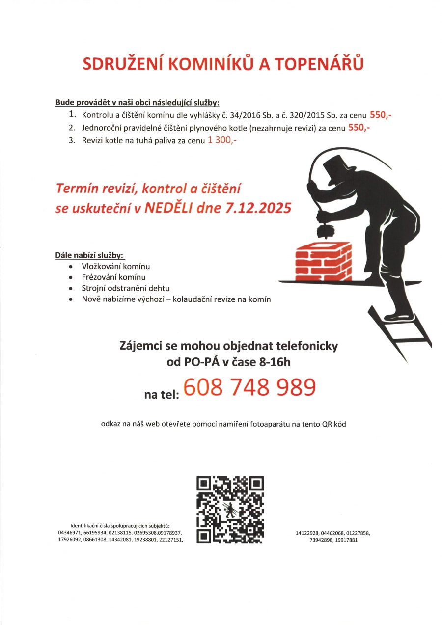 Termín revizí, kontrol a čištění se uskuteční v NEDĚLI dne 7. 12. 2025